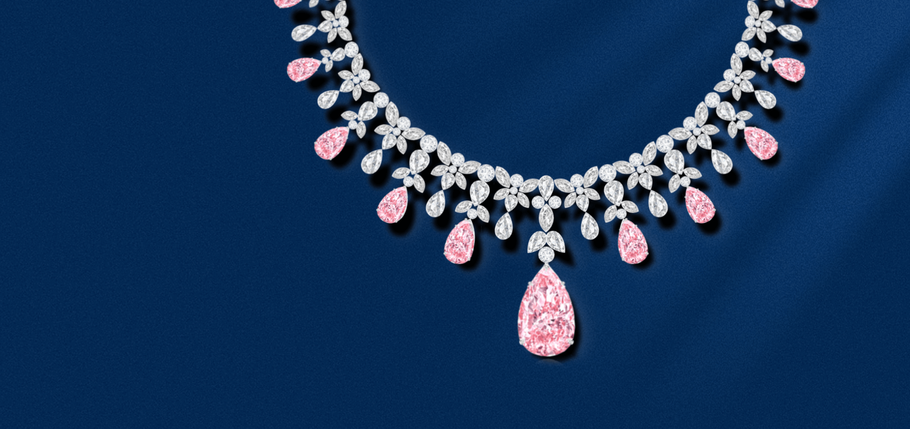 这款匠心独运的粉钻项链和皇冠两用款由十二颗梨形总重约68克拉的无暇艳彩粉钻和189.86克拉264颗无色钻石组成。明亮式圆钻和橄榄形钻石以锦簇式的镶嵌方式结合在一起犹如展翅的蝴蝶,呈现出三维立体的璀璨光芒,并散发出无尽的生命力,在经历一代代的传承后会更加举世夺目。